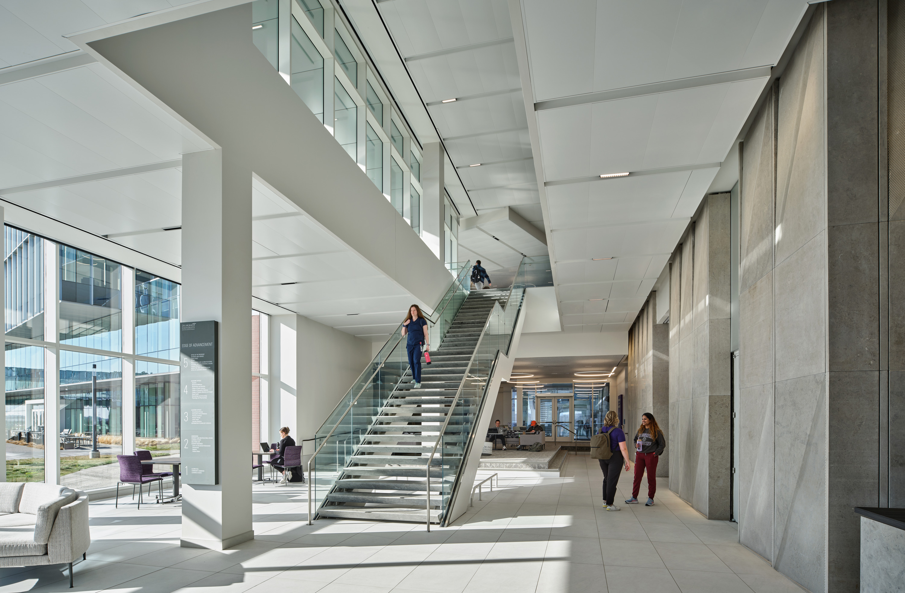 Rooted in the concept, From the Ground Up, campus leaders established a bold, new vision relocating DMU’s campus to an integrated single site nestled into the leading edge of a historic glacial advancement. This custom-carved stone element incorporates the site’s geological story, showcasing craftsmanship honoring the land’s history while creating a tactile and visual connection to its natural origins. The design begins with regionally sourced 4” thick natural stone material, then carving away small linear depths into the stone face, an angular edge produces a shadow, creating movement and connection. This element is introduced at the front door to campus, grounded on the first floor spanning two stories linking program space. The stone feature walls reoccur at key destinations throughout campus to provide visual cues to users guiding horizontal and vertical movement across the four buildings. The team carefully coordinated with structural to support the weight and lighting to accentuate the carved face, showcasing depth and texture. Multiple iterations and physical mock-ups were reviewed to finalize the size, depth, spacing and texture. This element symbolizes the cutting edge of advancement, tying back to the University’s mission of leading the way in innovation, inclusion, and sustainability.