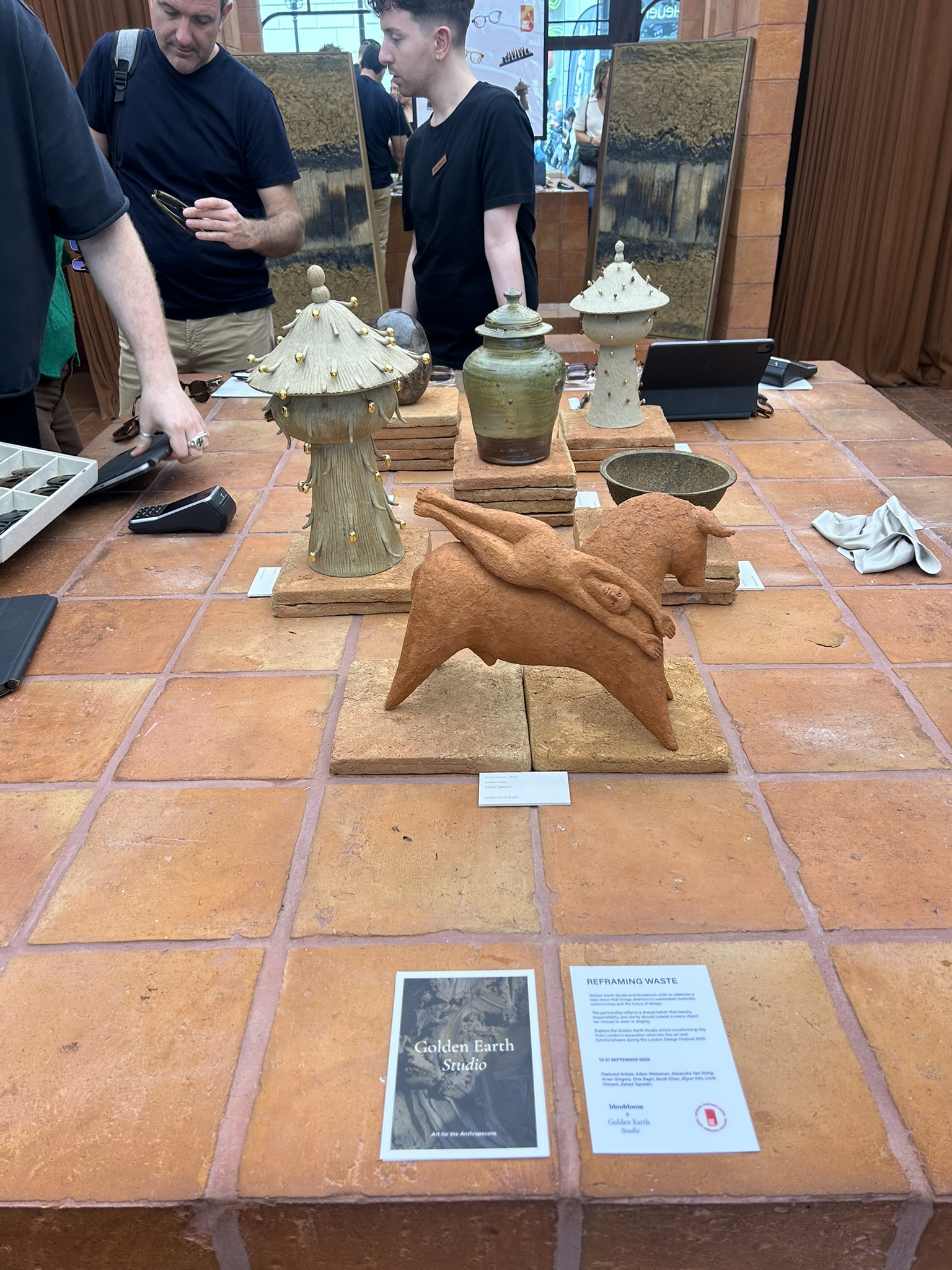 We began with Reframing Waste, a project by Golden Earth Studio and bloobloom that tackles London’s most overlooked raw material — its dirt. Rather than hiding the by-products of urban growth, it celebrates them. Excavated clay and earth from city building sites are reimagined as material for art and architecture, inviting us to see waste not as residue, but as resource.