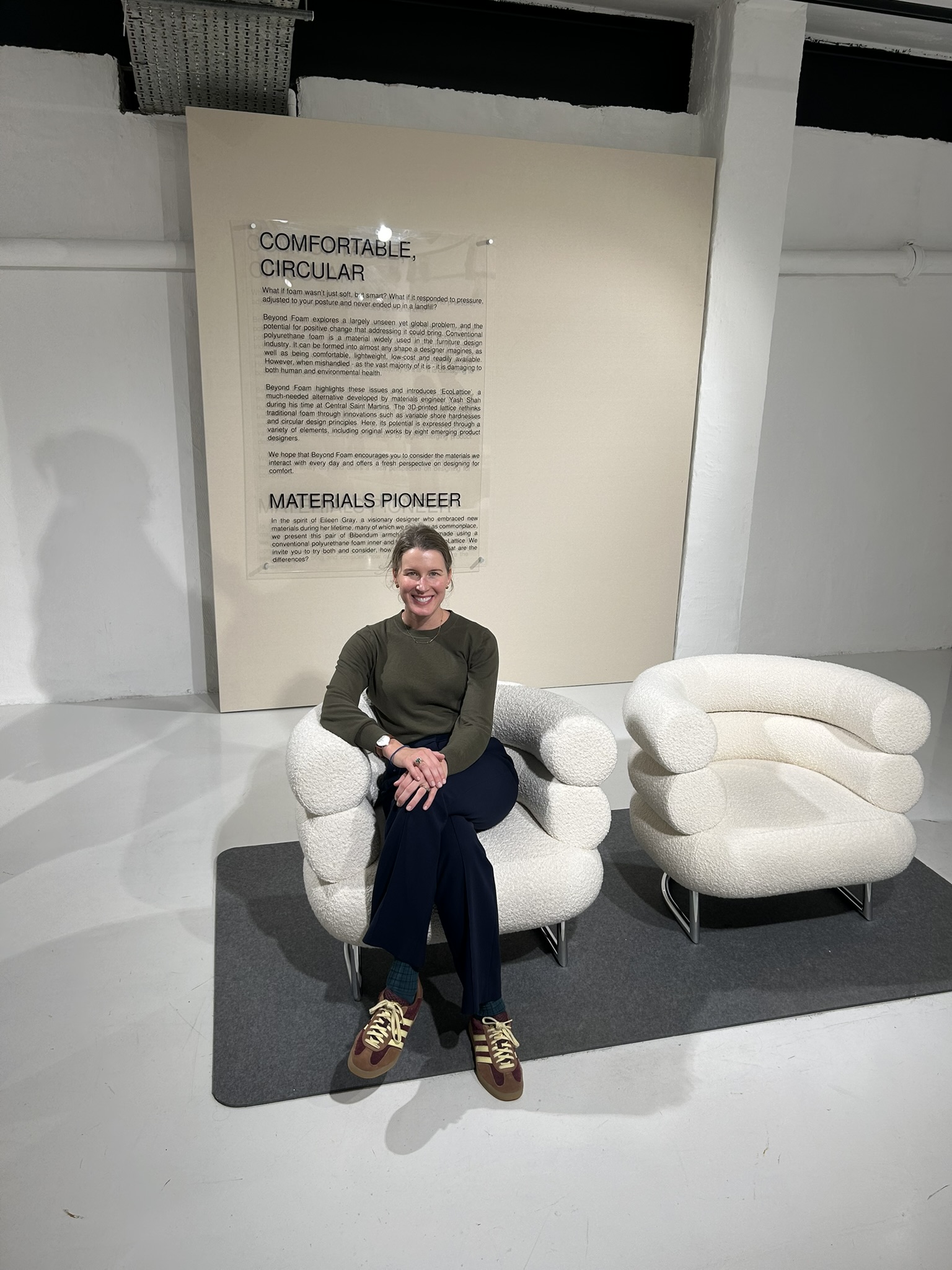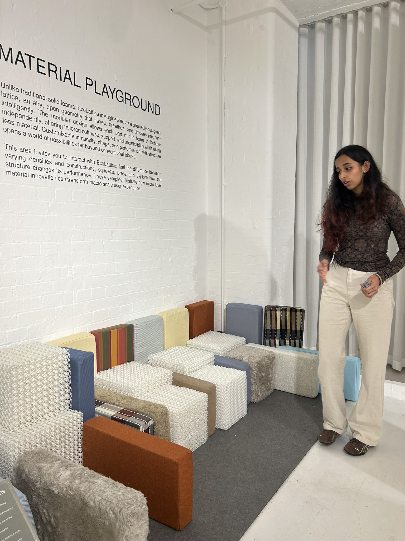 The next stop was Ecolattice, where the exhibition Beyond Foam challenged one of the most ubiquitous yet underappreciated materials of modern life. Foam cushions our furniture, insulates our buildings, packages our goods, and muffles our sounds. Yet it is also synonymous with waste – cheap, synthetic, and often environmentally harmful.