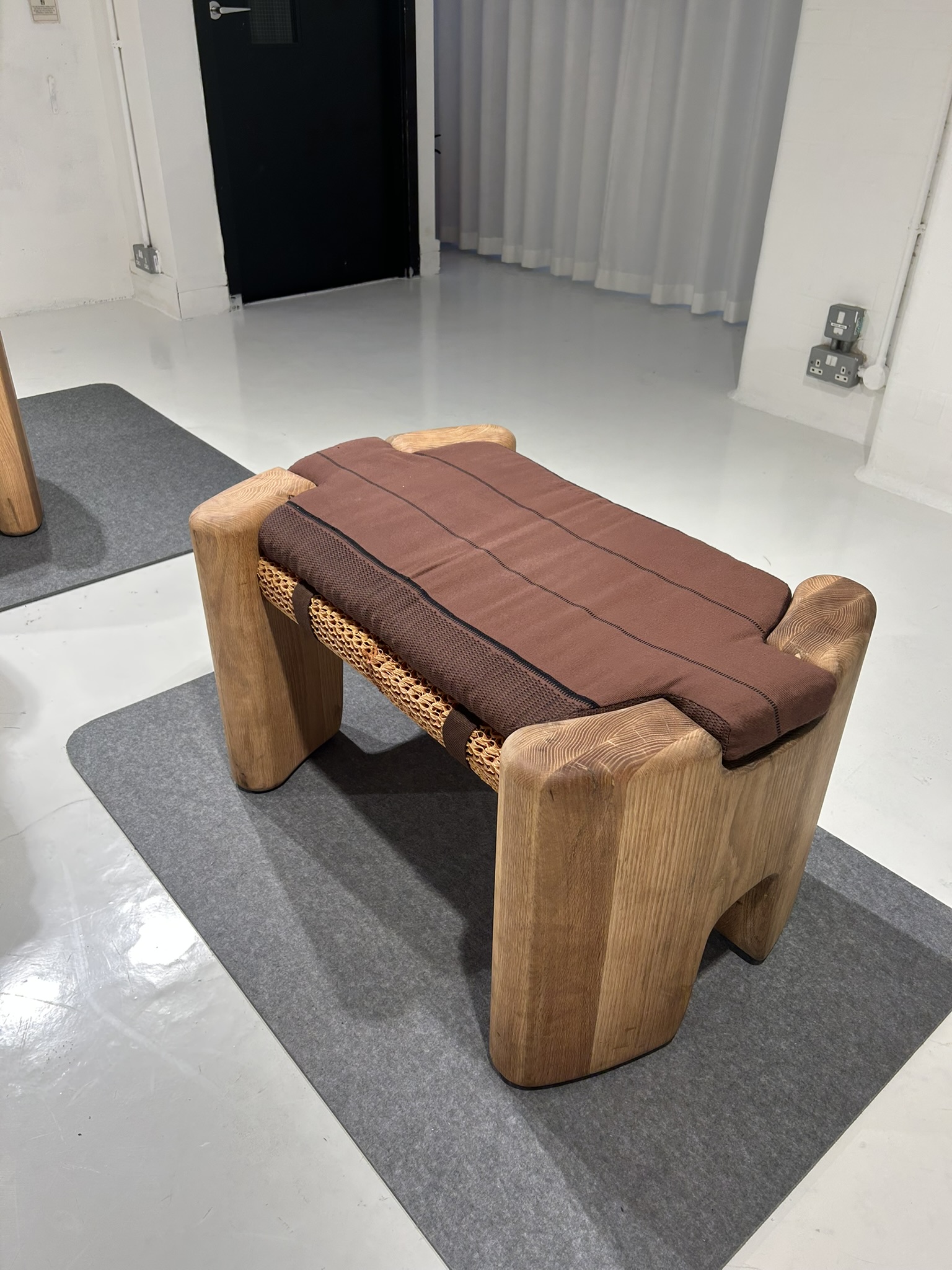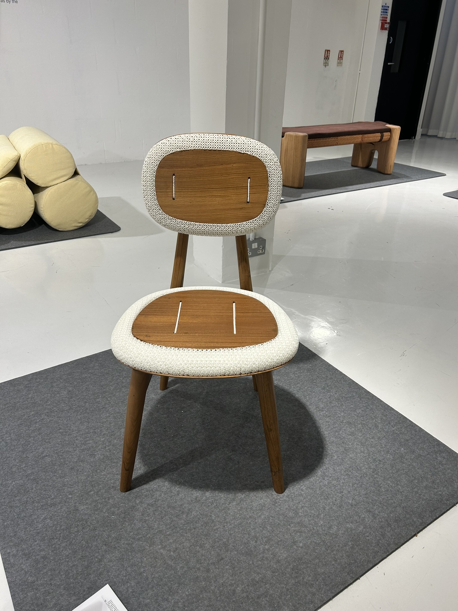 Beyond Foam showcased prototypes that blurred the line between product and sculpture. Geometric panels, translucent and honeycombed, hung like tapestries across the walls, catching light in shifting patterns. Seating prototypes invited visitors to touch, press, and sink in. A small stool, made of interlaced lattices, compressed underweight like foam but sprang back instantly.