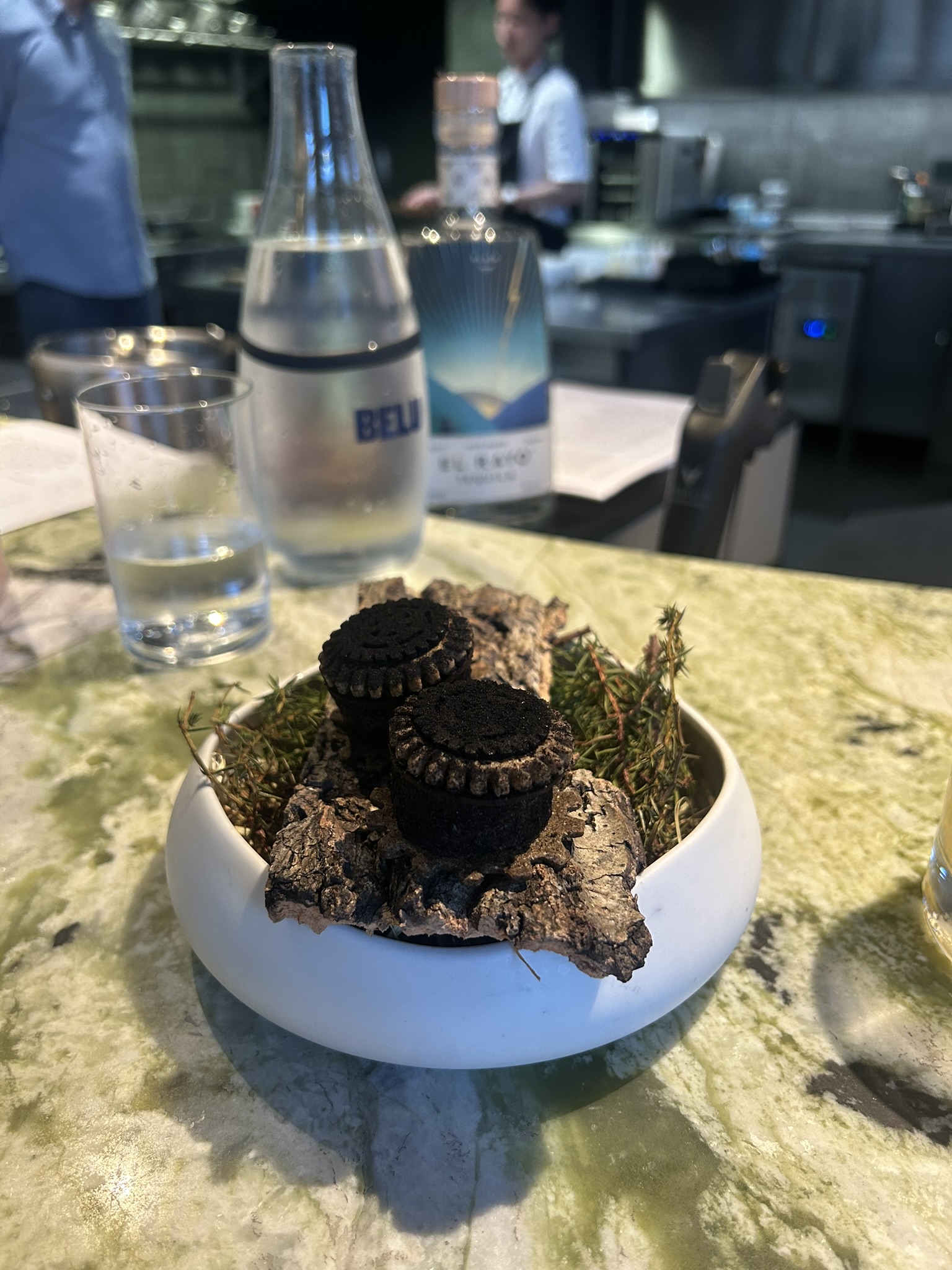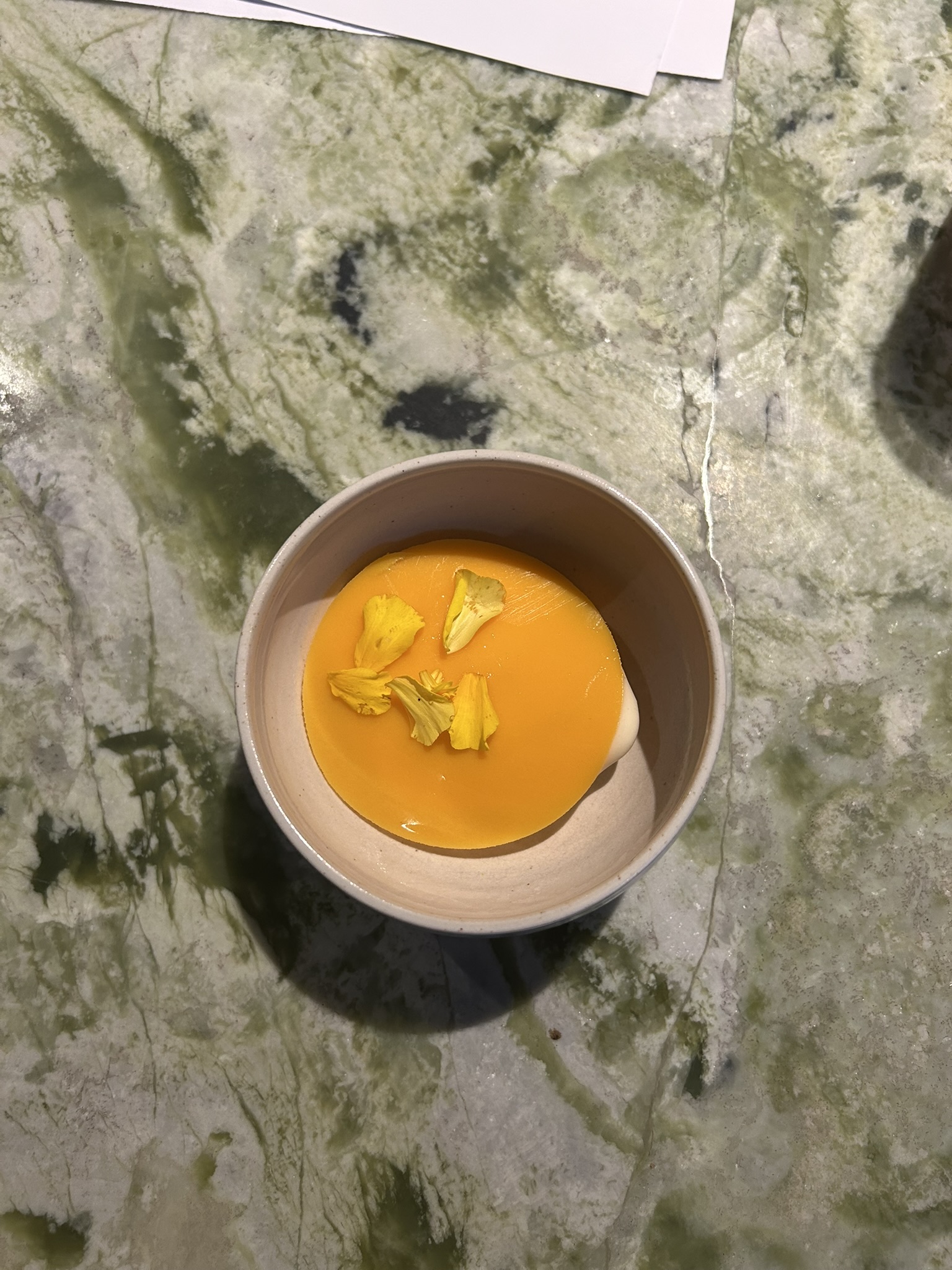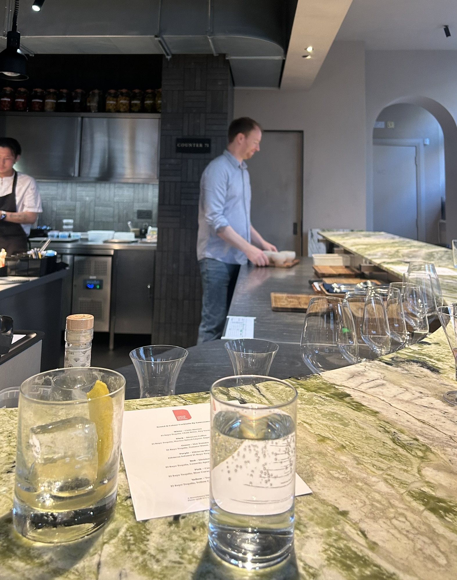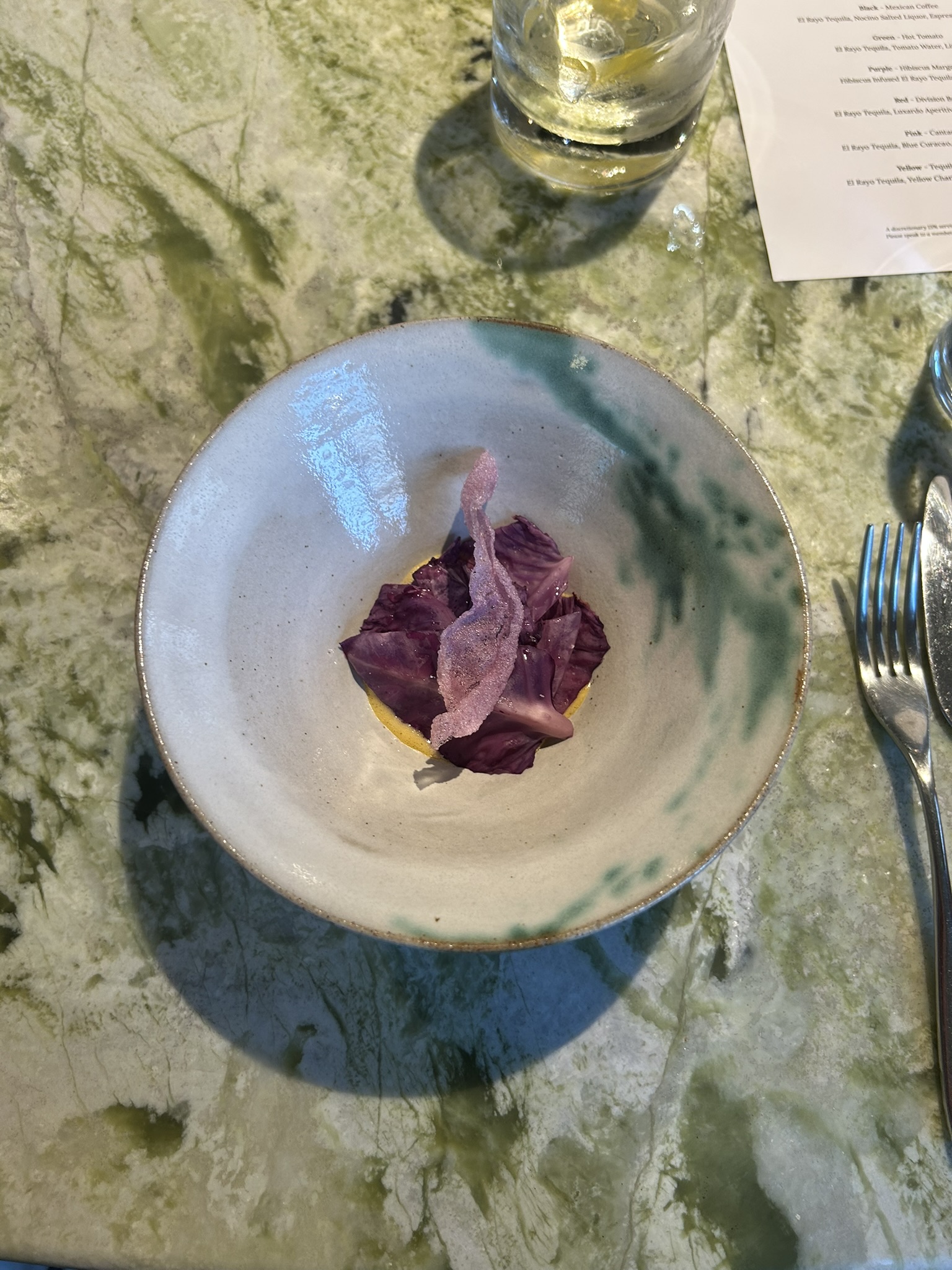 The setting was intimate, the kind of place where the kitchen is within arm’s reach, and the counter itself feels like part of the performance. The lighting was low, allowing each dish’s color to take center stage. The evening unfolded like a gradient, moving slowly through the spectrum — from quiet whites to deep blacks, through greens and purples, ending in a warm, golden glow.