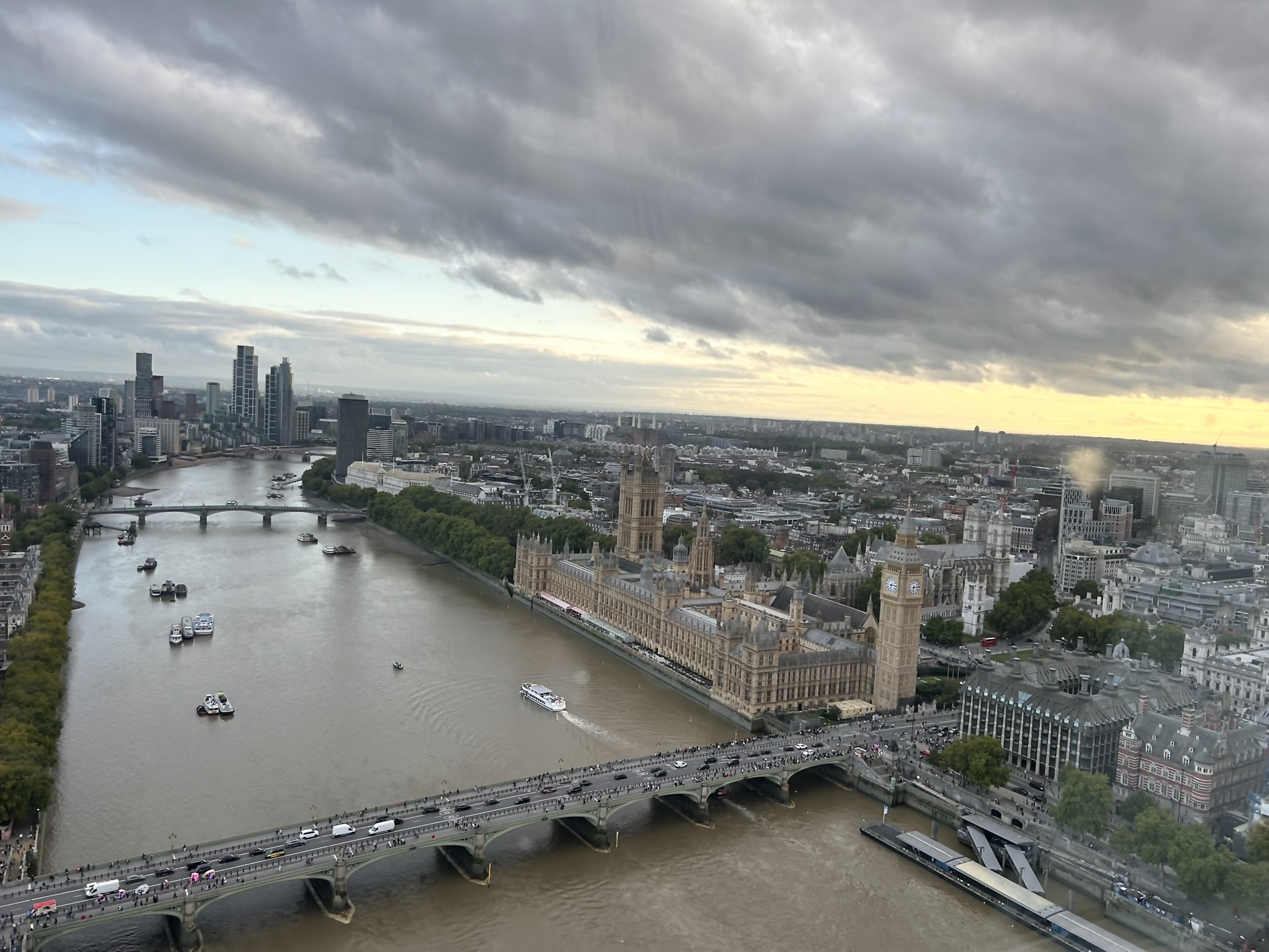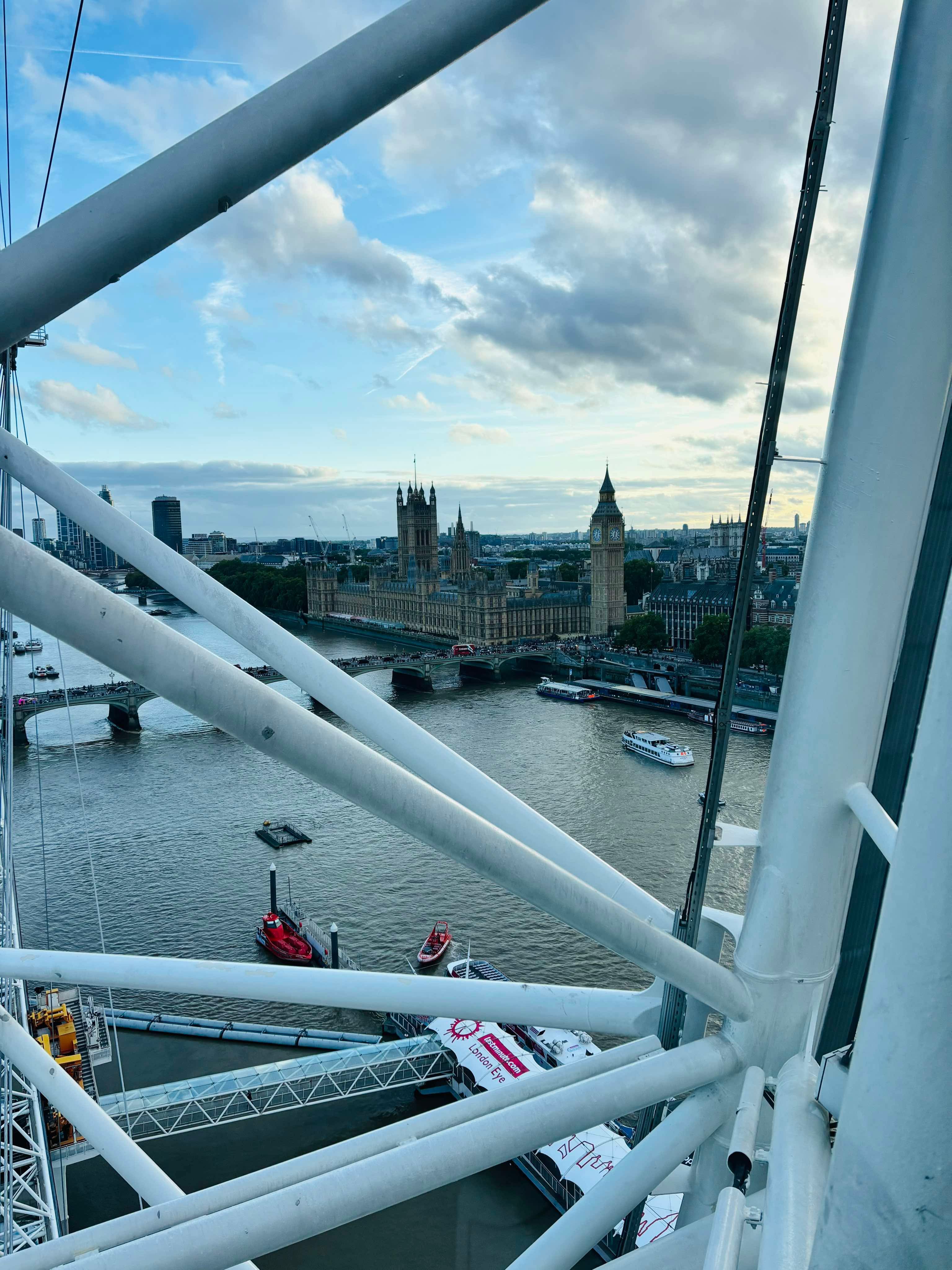 When boarding a capsule, the pace of the wheel surprises you. Unlike a Ferris wheel, it moves continuously, so boarding feels seamless. The ascent is slow and deliberate. To the west, Westminster Abbey and the Houses of Parliament. To the east, the Shard pierces the sky. Directly below, the Thames curves through the city.