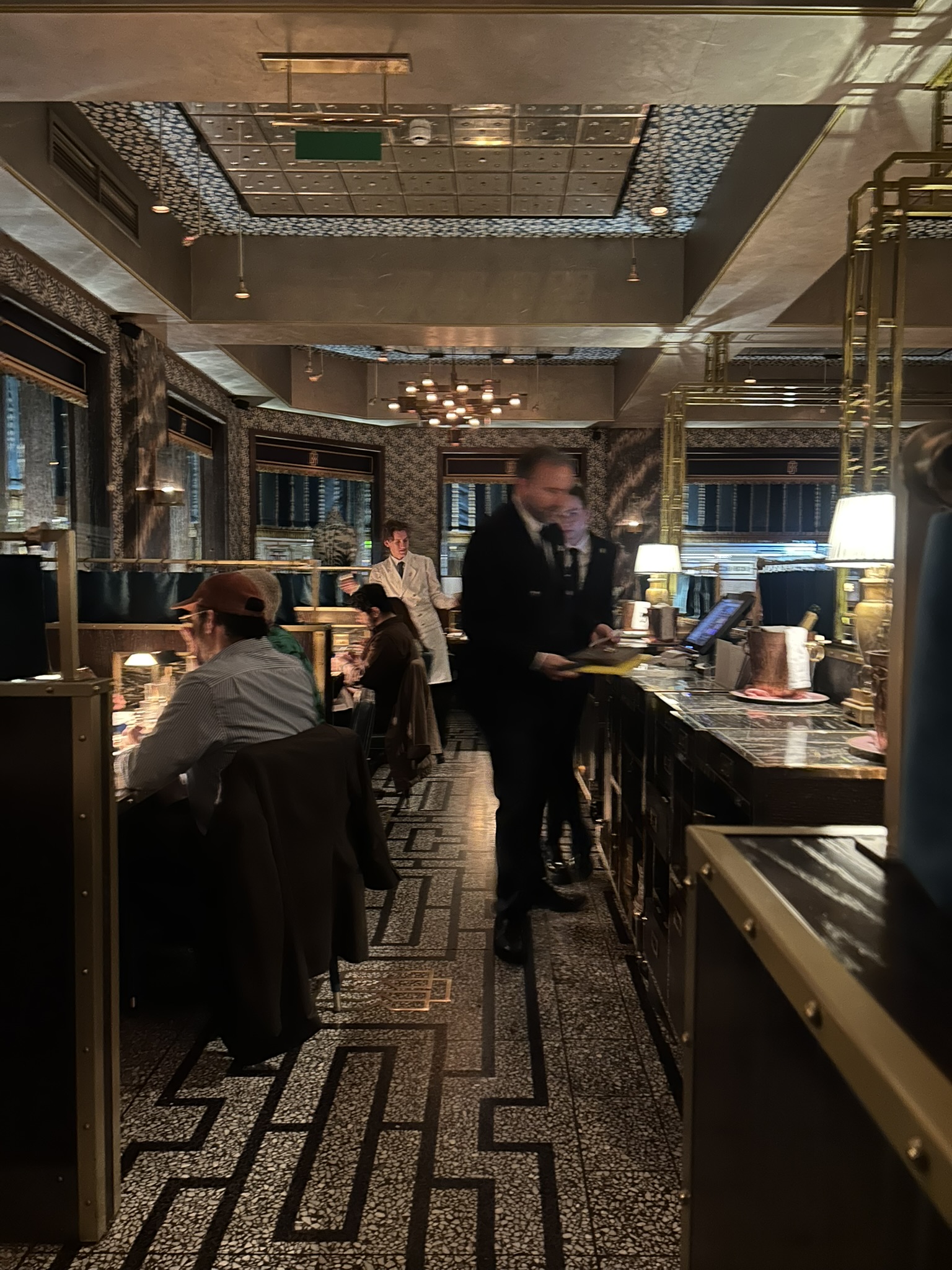 Step inside and you’re instantly transported somewhere between a 1930s train carriage and a diamond showroom. Brass rails gleam, booths are upholstered in quilted blue leather, and the lighting, oh, the lighting, is pure gold. It’s the kind of space that begs to be enjoyed slowly, ideally with a glass of champagne in hand.